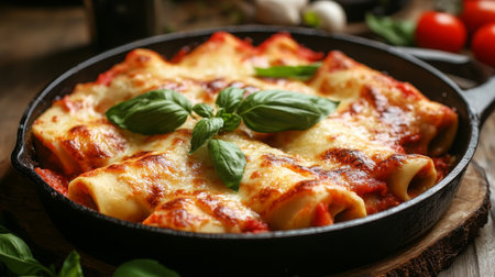 Close up of freshly prepared cannelloni filled with savory meat sauce and topped with melted cheese, a culinary masterpiece, perfect for a satisfying meal.