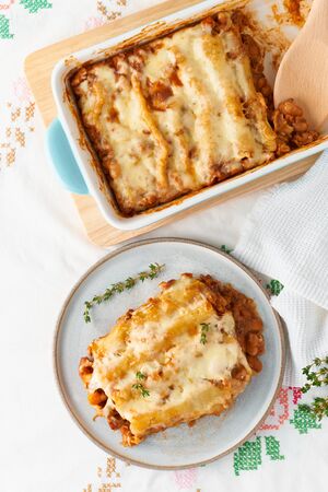 Cannelloni pasta with filling of ground beef, tomatoes, baked with bechamel tomato sauce and a mozzarella. Classical Italian cuisine, white tablecloth with embroidery, rustic style, top view, vertical