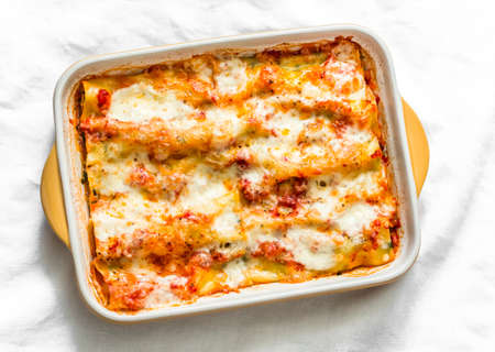 Cannelloni with spinach and ricotta baked with tomato sauce and mozzarella on a light background, top view