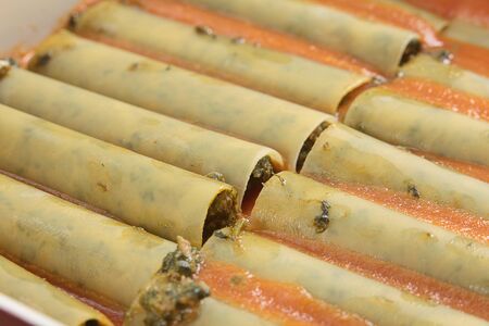 Close up to cannoli pasta stuffed with spinach and feta cheese,selective focus