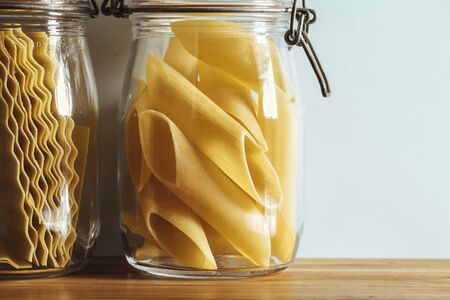 Glass jars with raw pasta, on the kitchen shelf, in front of the blue wall