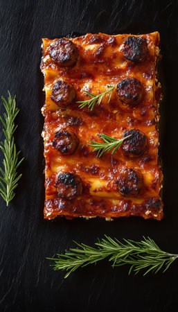Authentic Italian Sausage Lasagna Delight on Dark Stone Background, a Culinary Classic Dish.