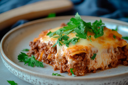 A delicious slice of cheesy beef lasagna is placed on a decorative plate, topped with fresh parsley, in a warm kitchen atmosphere, showcasing a homely meal.