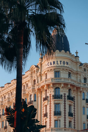 Cannes, France - 30.01.2023 : Close-up of the facade of Carlton hotel in Cannes, during the golden hour