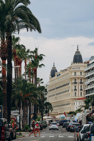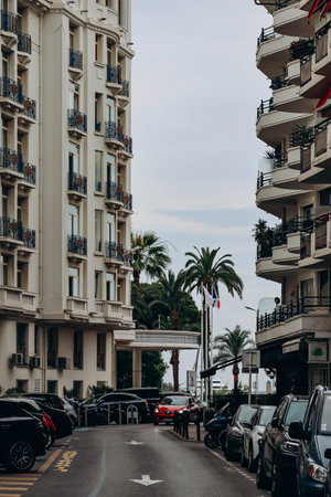 Cannes, France - 30 June 2023: Street overlooking the Croisette, part of the facade of the Hotel Martinez