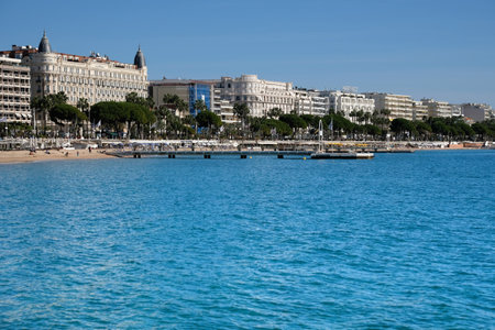 Cannes, France - October 25, 2017 : view of the sea and beach in front of the Carlton International Hotel situated on the croisette boulevard in Cannes, France
