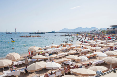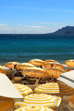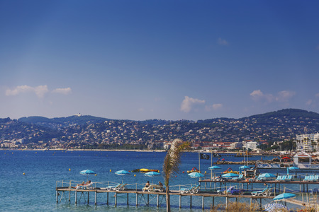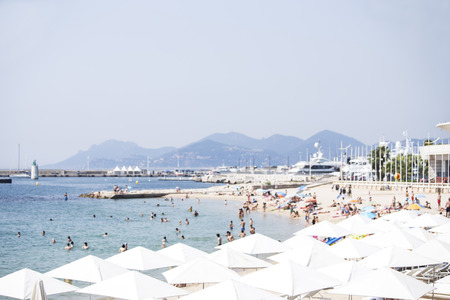 CANNES, FRANCE - JULY 5, 2014. The beach in Cannes. Cannes located in the French Riviera. The city is famous for its Film Festival. FRANCE, - JULY 5, CANNES 2014