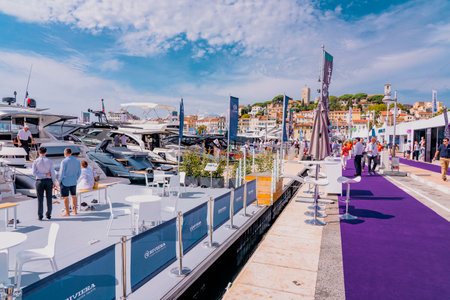 Cannes, France - 10.09.2021: Annual Yacht Show Festival in french riviera. The largest luxury yacht, new technologies in the world of yachts. Participants come from all the world for the yacht show.