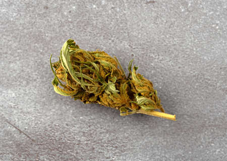 Top view of a marijuana bud on a gray table illuminated with natural light.