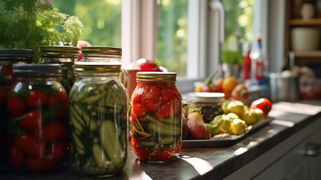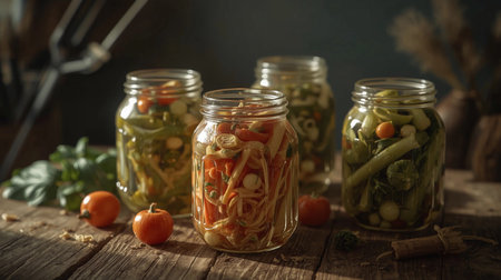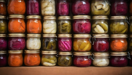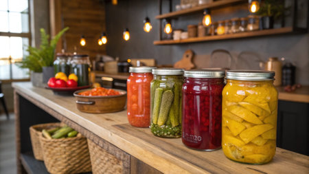 A beautiful arrangement of colorful jars showcasing preserved vegetables. This image captures the essence of homemade preservation and vibrant cooking.