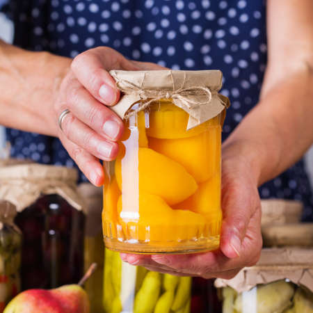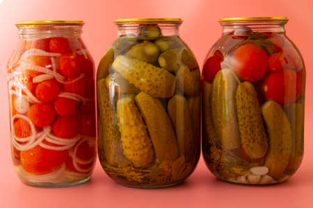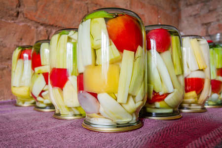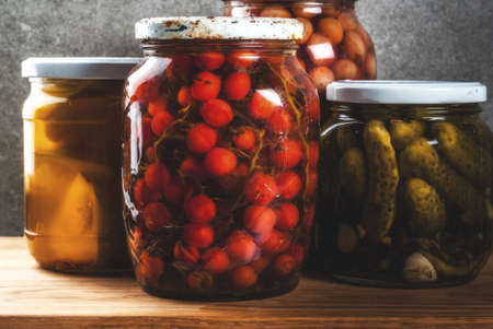Homemade preserved, fermented food, pickled, marinated vegetables, fruit compote