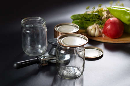 Vegetables for canning on background and canning tool with glass jars on a front, on black background.