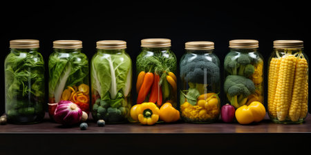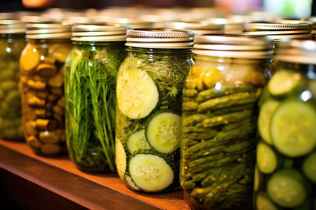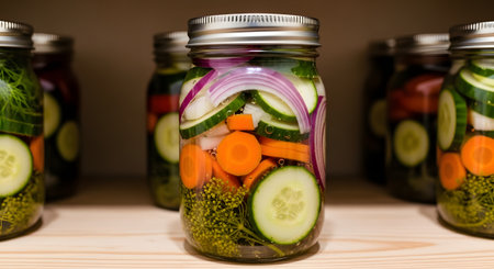 A vibrant display of glass jars filled with preserved vegetables, showcasing colorful pickles and homemade ingredients. Perfect for food enthusiasts and culinary projects.