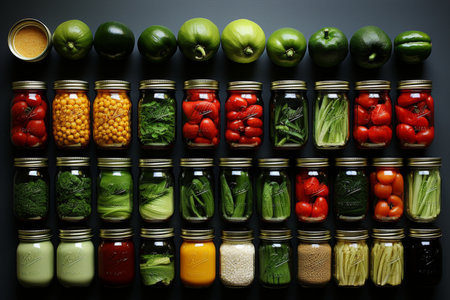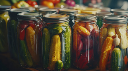 A vibrant display of colorful jars filled with pickled vegetables, showcasing a variety of fresh ingredients perfect for home preservation and culinary delights.
