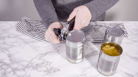 Man's hands open a tin can with an old can opener with a wooden handle. Canned food and a special knife. Adult male of European race.
