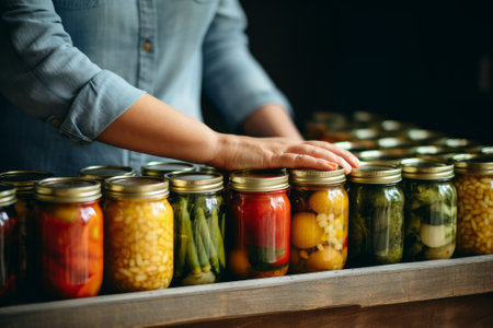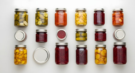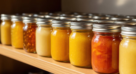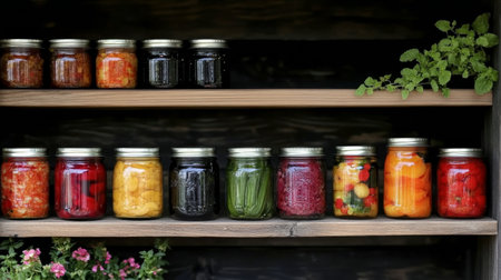 Rows of colorful glass jars with canned fruits and vegetables preserving the harvest