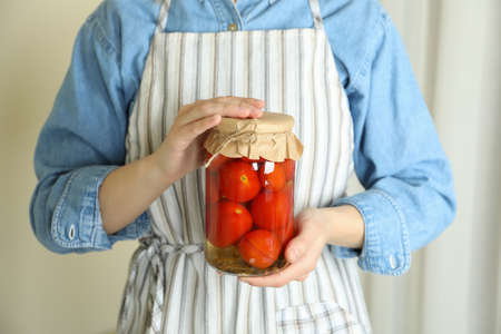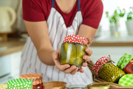 Woman jar preserve vegetables in the kitchen. selective focus. food.