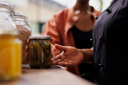 Closeup of african american person with an apron at local market selling fresh eco-friendly produce, advising customer on sustainable food choices. Female seller showing client glass jar of organic pickles.