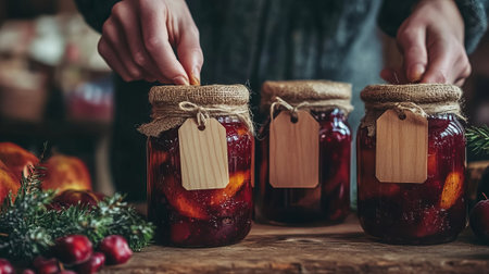 Hands preparing jam jars in a rustic kitchen setting during daylight