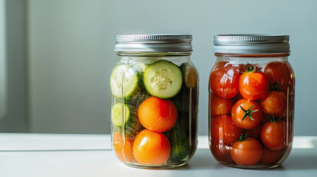 A clean, minimalistic shot of two glass jars, one with cucumbers and the other with tomatoes, placed on a white surface to highlight the bright preserved produce.