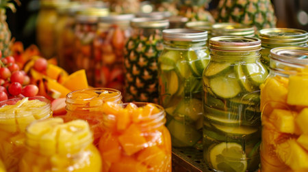 Glass jars filled with vibrant preserved fruits like peaches, raspberries, and citrus slices, neatly arranged on a polished marble kitchen countertop, showcasing homemade goodness and healthy eating.