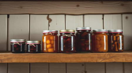 Colorful preserved foods in glass jars neatly organized on wooden shelves, evoking warmth and rustic charm in a food pantry setting.