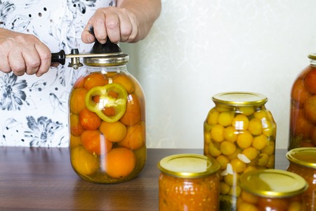 Details: housewifes hands using seamer, closes lids of a jar with fermented organic homegrown cherry tomatoes. Homemade canned food. Preserving fresh seasonal harvest for the winter. Mmarinating