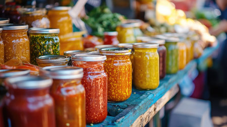 Inviting display of colorful jars filled with housemade preserves and pickles offering guests a taste of seasonal flavors yearround..