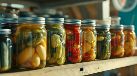 A vibrant display of jars filled with various preserved fruits and vegetables sits neatly on a kitchen shelf, illuminated by natural sunlight, showing a variety of colors and textures.