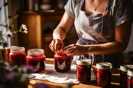 Close-up of a woman sealing jars of freshly made strawberry jam in a sunny kitchen