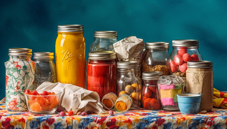 Vibrant multi colored fruit collection in homemade glass jar decoration generated by artificial intelligence
