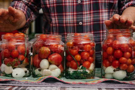 Three jars with ripe red tomatoes with herbs ready to pickle making, standing outdoor on the summer sun.