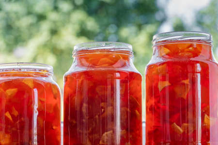 Apple jam in a different sizes glass jars on the nature background. Concept of eco product and harvest of summers fruits. Close-up.