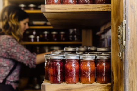 Shelves filled with colorful homemade preserves while a woman carefully arranges jars in a cozy kitchen.