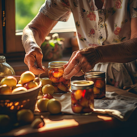 authentic photo of soiled female hands of elderly woman, cooking canned tomatoes from harvest in kitchen, putting vegetables in glass jars, cooking
