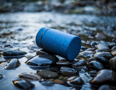 A blue speaker rests on smooth river rocks, blending technology with natures tranquility in a serene outdoor setting. Perfect for relaxation and music.