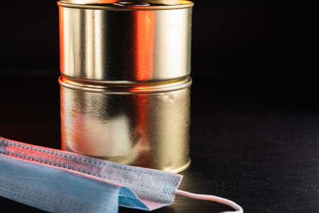 medical mask and two cans of canned food on a dark background. dramatic. horizontal