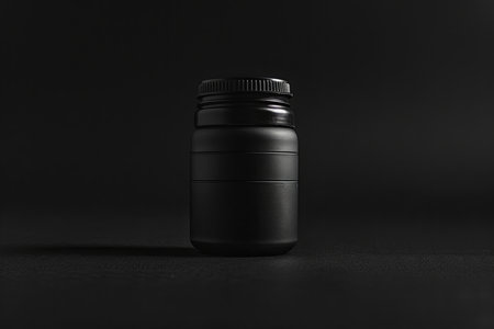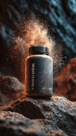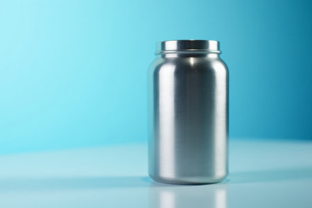Supplement container mockup. Blank metallic protein powder or supplement jar against turquoise background, minimalist product photography setup.