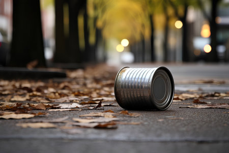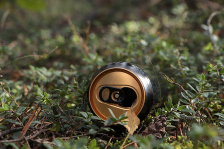 Used aluminum can on green grass outdoors, space for text. recycling problem
