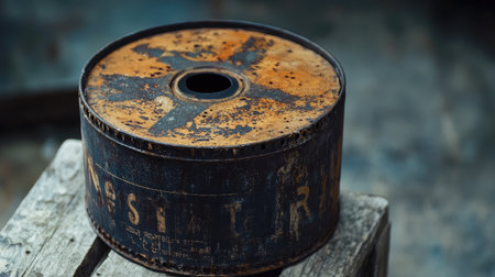 This vintage metal container features a distressed, rusty surface and a unique design element, perfect for adding an industrial touch to any space or project.