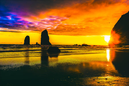 Breathtaking sunset at Haystack Rock on Cannon Beach with colorful sky and reflections from the calm water on the beach