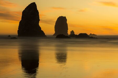 The Needles at Cannon Beach during a sunset. Long exposure make the wave misty.