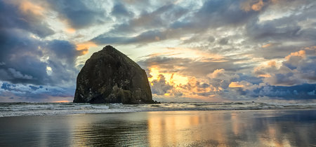 A view of the famous Haystack Rock Monolith in Cannon Beach, Oregon.