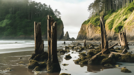 Tranquil beach with weathered driftwood along the sandy shore at twilight