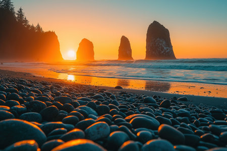 Warm hues cast a glow over rugged shoreline featuring towering sea stacks and polished pebbles, creating a tranquil, picturesque coastal scene.