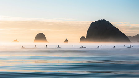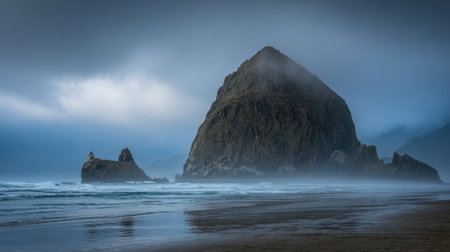 A scenery of the Haystack Rock in the morning fog at Cannon Beach, Oregon
