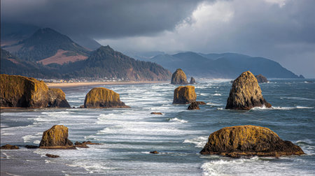 A scenery of rocks at the coastline of the Pacific Northwest in Cannon Beach, Oregon