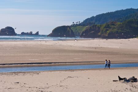 two woman having a peaceful walk on the beach, at cannon beach, oregon.