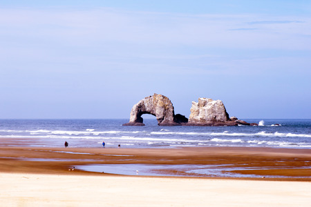 Two rocks ocean waves planed stick out of the water on a beautiful quiet sandy shores of the Pacific Ocean