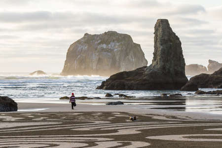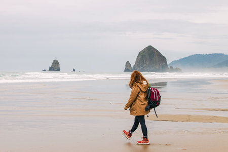A woman walks along the serene beach at Cannon Beach, Oregon, exploring the coastline on a cloudy day